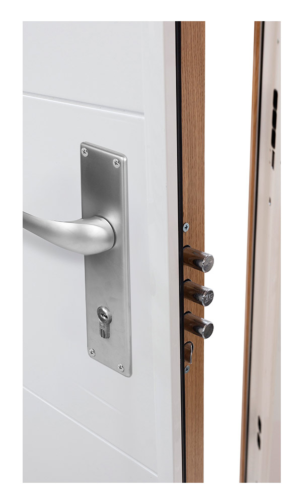 Estructura acorazada completa: hoja y marco fabricados con refuerzos de acero de alta densidad.